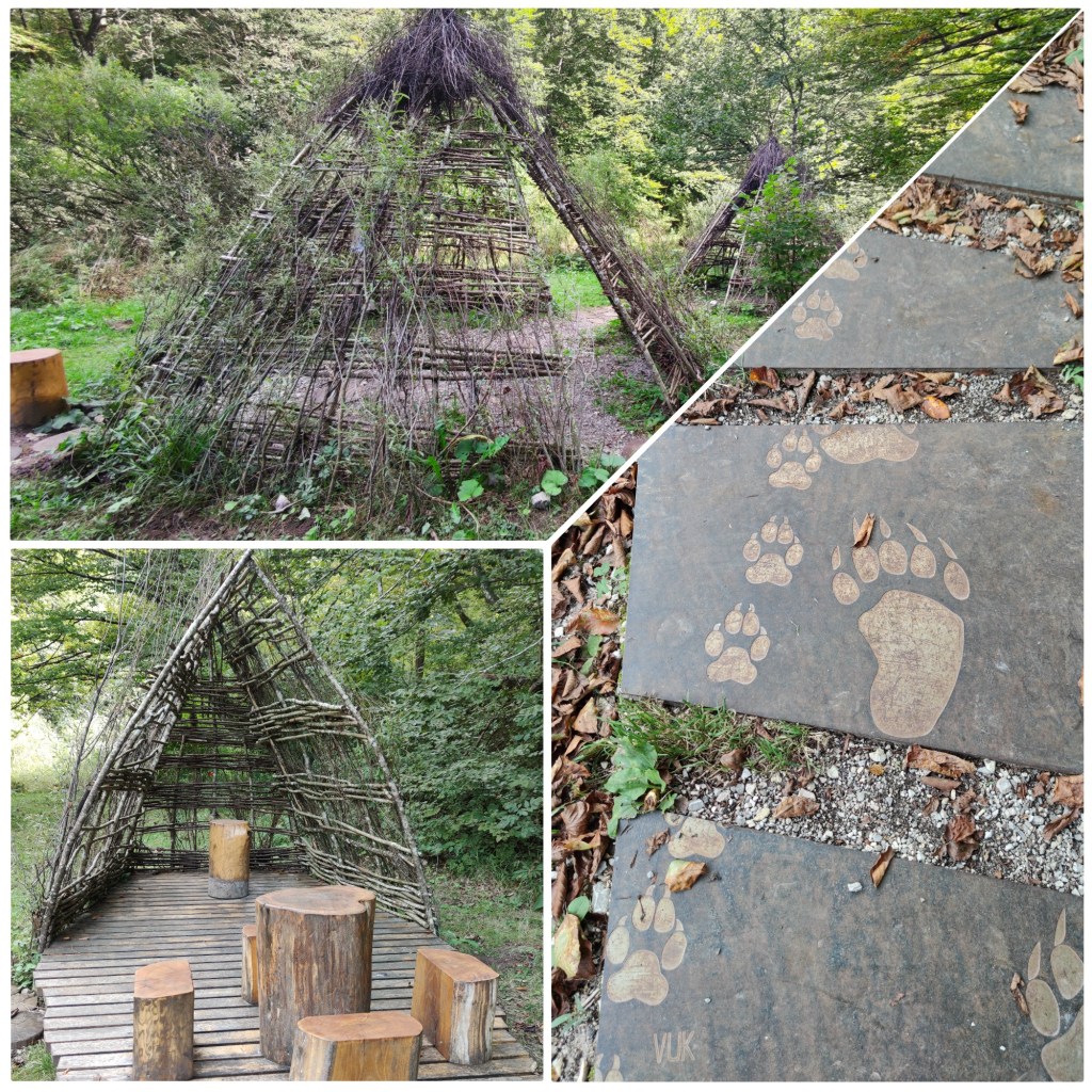 Nešto prije samog izvora, nalazi se izletište s preslatkim kućicama/šatorima od granja. Idealno mjesto za napraviti malo dulju pauzu i pojesti sve što imaš (ogladni čovjek od divljenja i nafotkavanja 😉 ). Tu su i životinjski tragovi utisnuti u stazu – ako ih vidiš negdje putem, da znaš što ti se sprema. A ima tamo medvjeda, zato se na početku staze nalaze i upute što učiniti ako naletiš na njega. Navodno i vukovi navrate, posebno zimi. (Dakle, definitivno ne idem tamo kad zapadne snijeg.)
